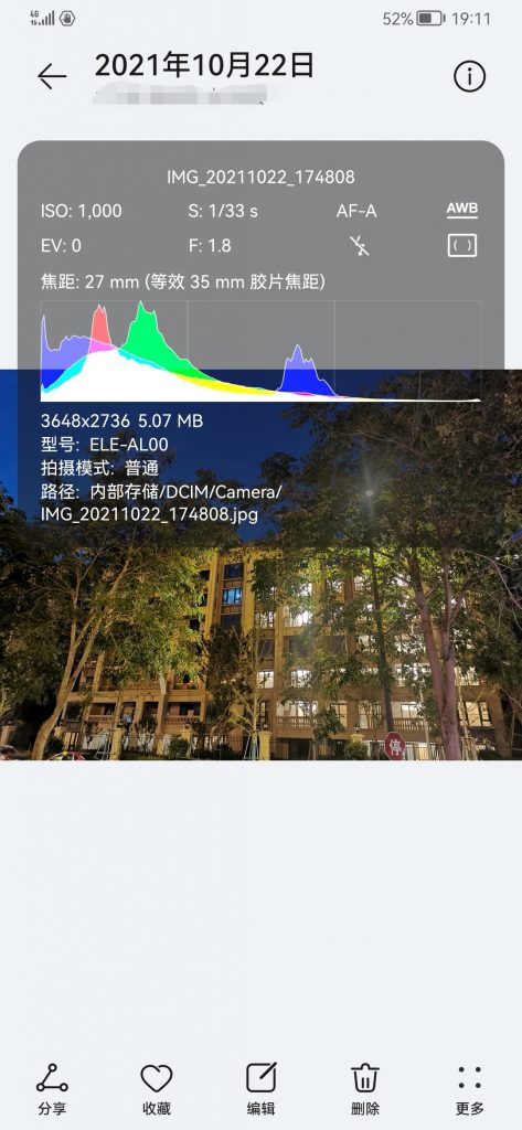 点击右上角的“i”还能看到相机拍摄时的具体参数以及手机型号等信息。