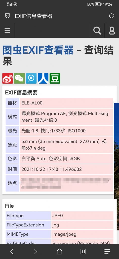 看到这里,你可能会担心:那我的位置信息不是完全暴露了吗?事实上也没必要过于担心,因为只要是正规的社交平台,都会将照片EXIF中的位置、手机型号等信息抹掉。发布在朋友圈、QQ空间、微博等平台的图片都不会包含位置等敏感信息。