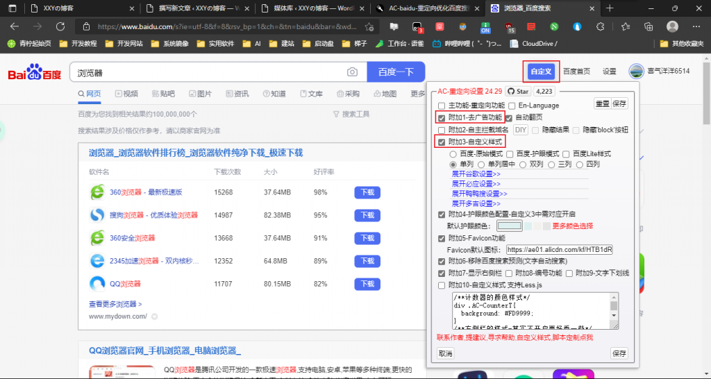 此时访问百度,可以看到出现了“自定义”按钮,推荐打开附加1和附加3.